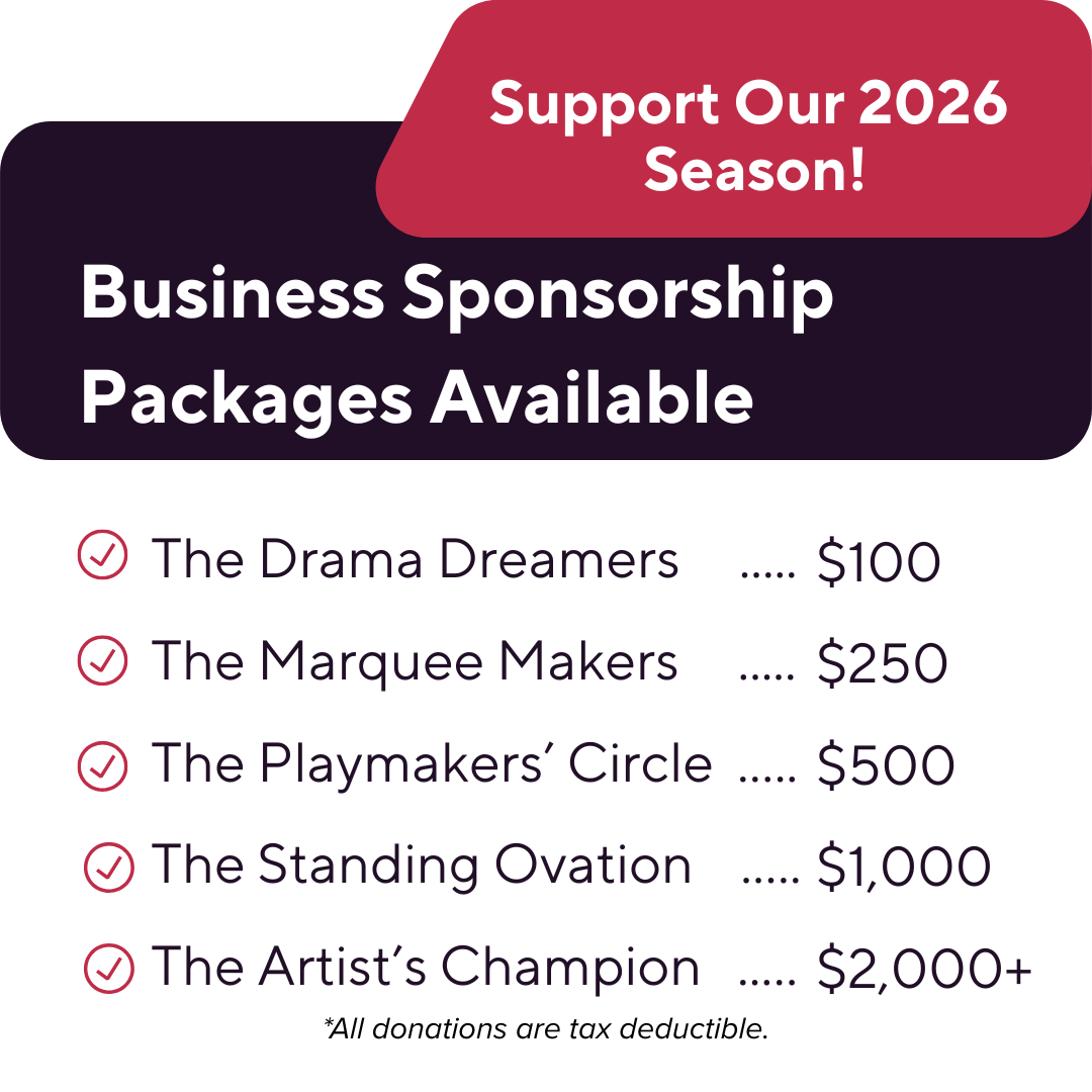 As a nonprofit theater company, we rely on the contributions from our community to bring these original shows to the stage. Learn more about how to become a Business Sponsor or make a general donation to help support our upcoming season!